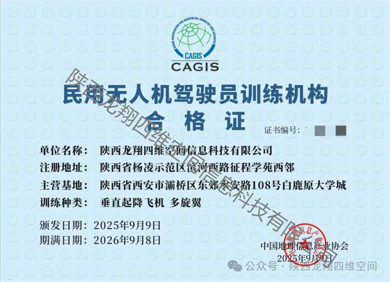 days 09 /12 熱烈祝賀陜西龍翔四維空間信息科技有限公司成功取得民用無人機駕駛員訓練機構合格證! 恭喜陜西龍翔四維空間信息科技有限公司斬獲民用無人機駕駛員訓練機構合格證!這是專業實力的硬核認證,也是信任的基石,愿以此為起……